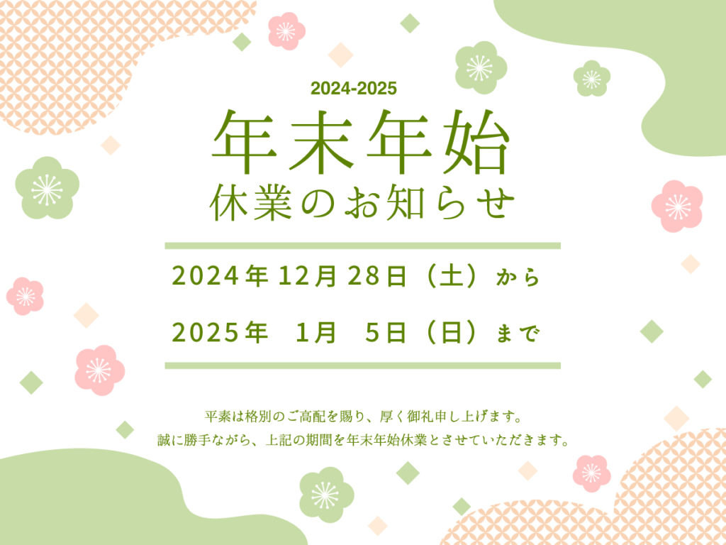 誠に勝手ながら、弊社の年末年始の営業につきましては下記の通りとさせていただきます。休業期間中は大変不便をおかけいたしますが、何卒ご理解くださいますよう、お願い申し上げます。 年末年始休業期間2024年12月28日(土) 〜 2024年1月5日(月) 株式... -